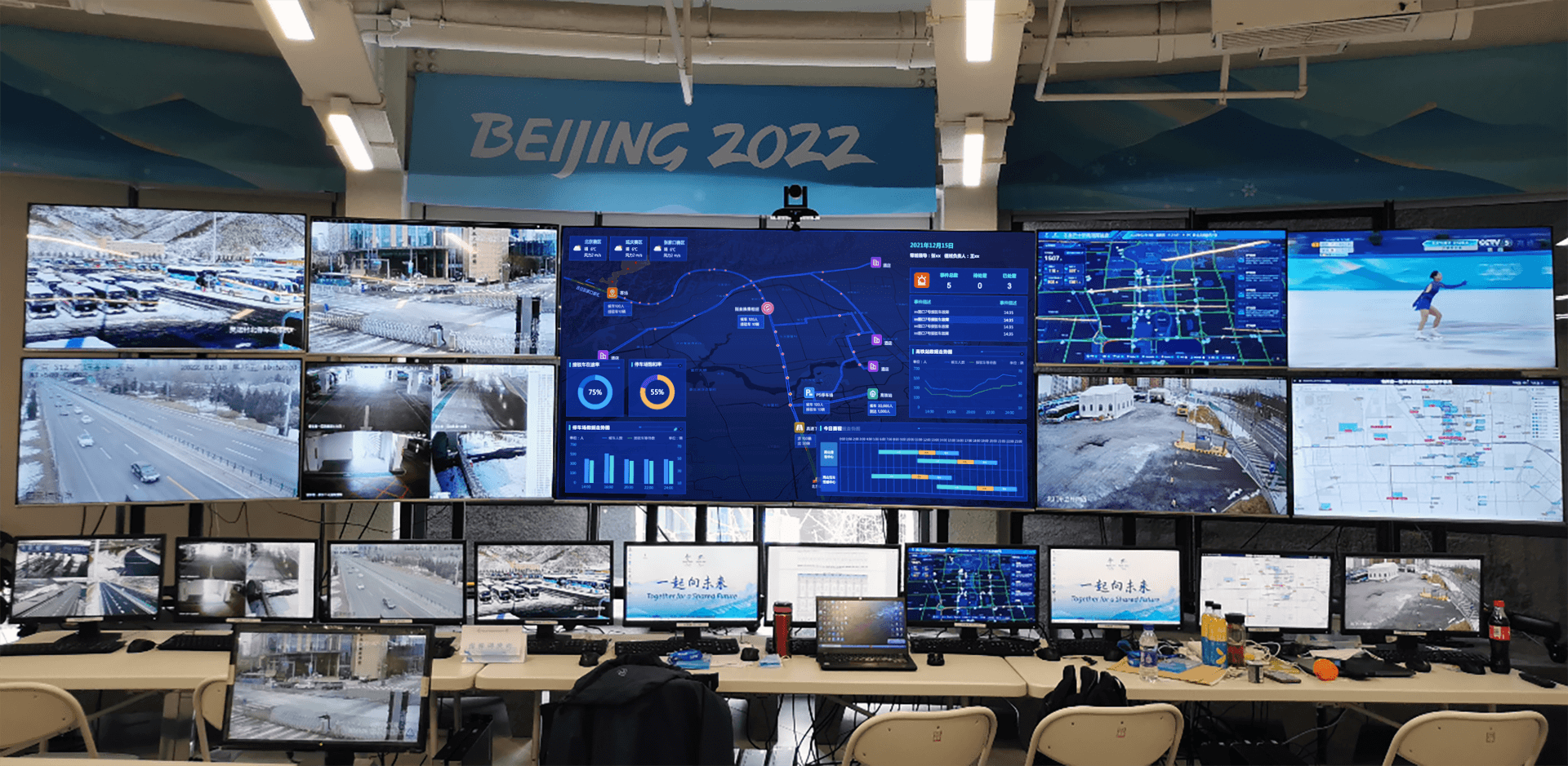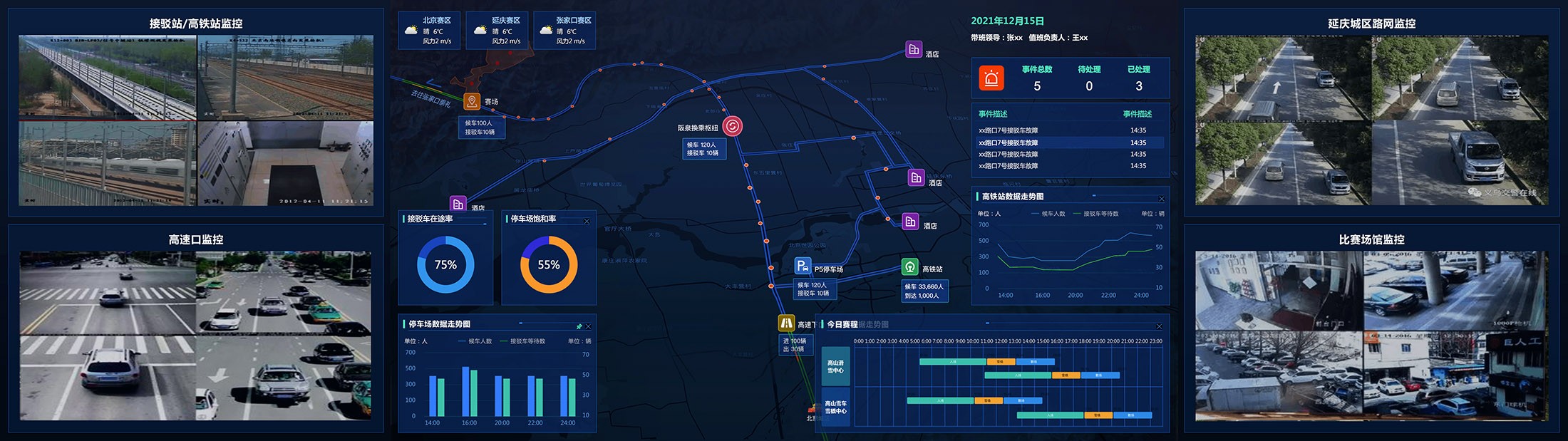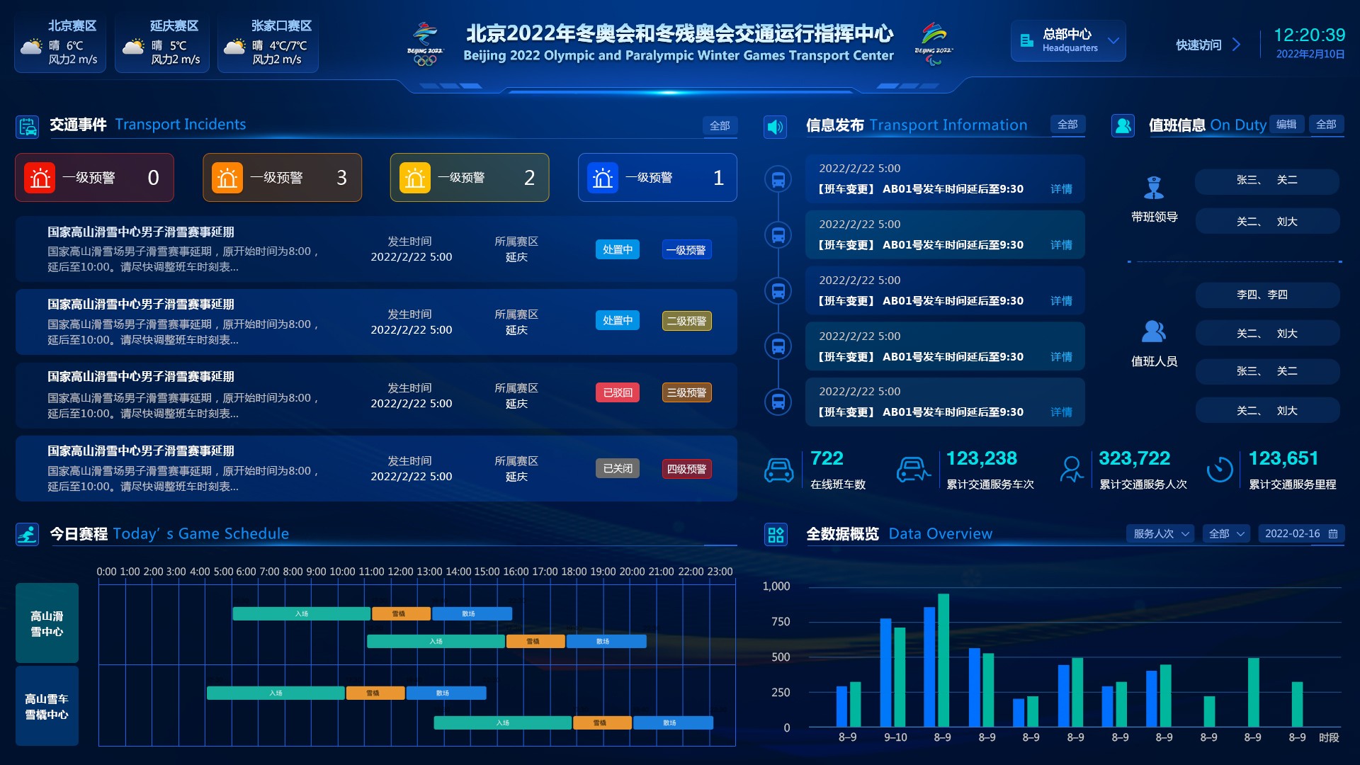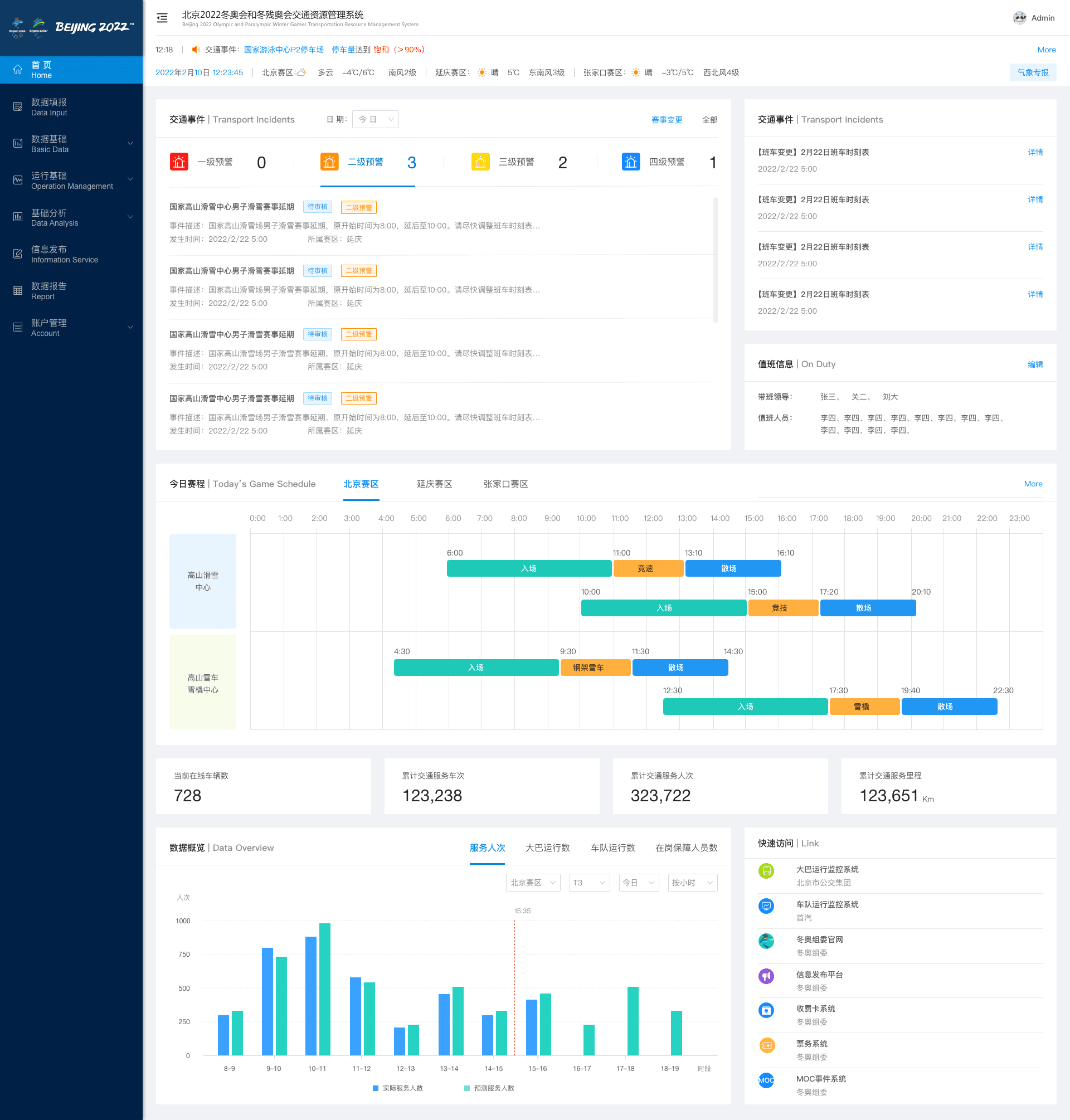 2022年北京冬奥会交通保障系统是一款综合性智能平台,涵盖指挥调度系统、资源管理系统、大屏监控系统、车辆接驳及OTC(奥运村交通协调)等核心模块。系统支持PC端精细操作、手机端移动指挥,以及大屏端实时可视化展示,旨在为冬奥赛事提供高效、安全的交通支撑。UI设计采用蓝色调奥运主题,结合波浪状抽象图形,营造科技感与活力。