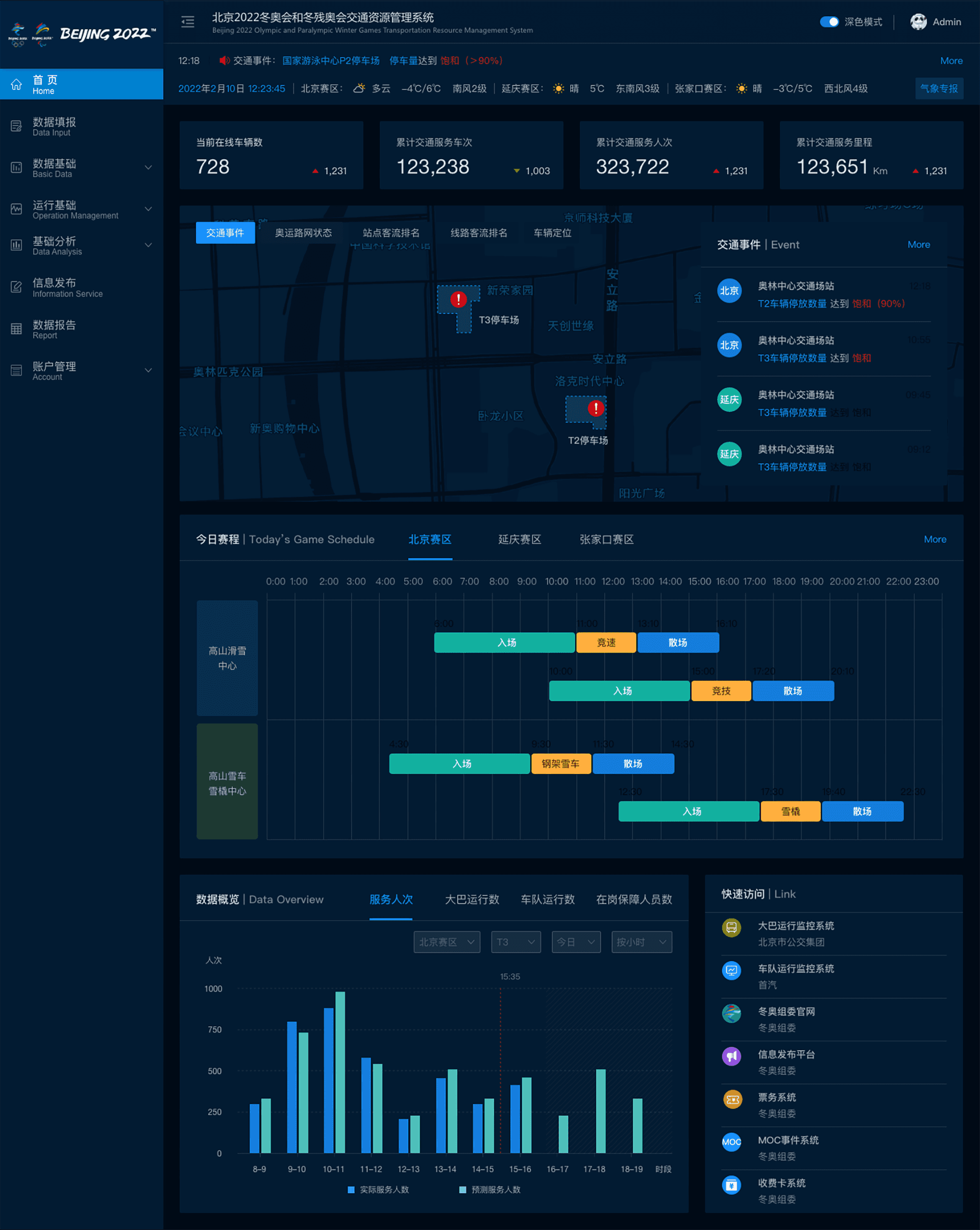 The 2022 Beijing Winter Olympics Transportation Support System is an integrated intelligent platform, encompassing a Command and Dispatch System, Resource Management System, Large-Screen Monitoring System, Vehicle Shuttle Service, and OTC (Olympic Village Traffic Coordination). It supports detailed operations on PC, mobile command on smartphones, and real-time visualization on large screens, aiming to ensure efficient and safe transportation for athletes, officials, and spectators. Featuring a blue-toned Olympic theme with wave-like abstract graphics, the UI design blends tech-forward aesthetics with vitality.